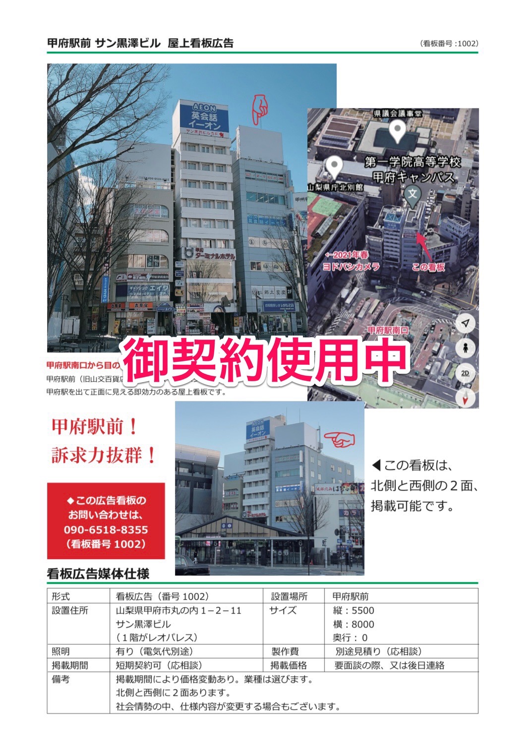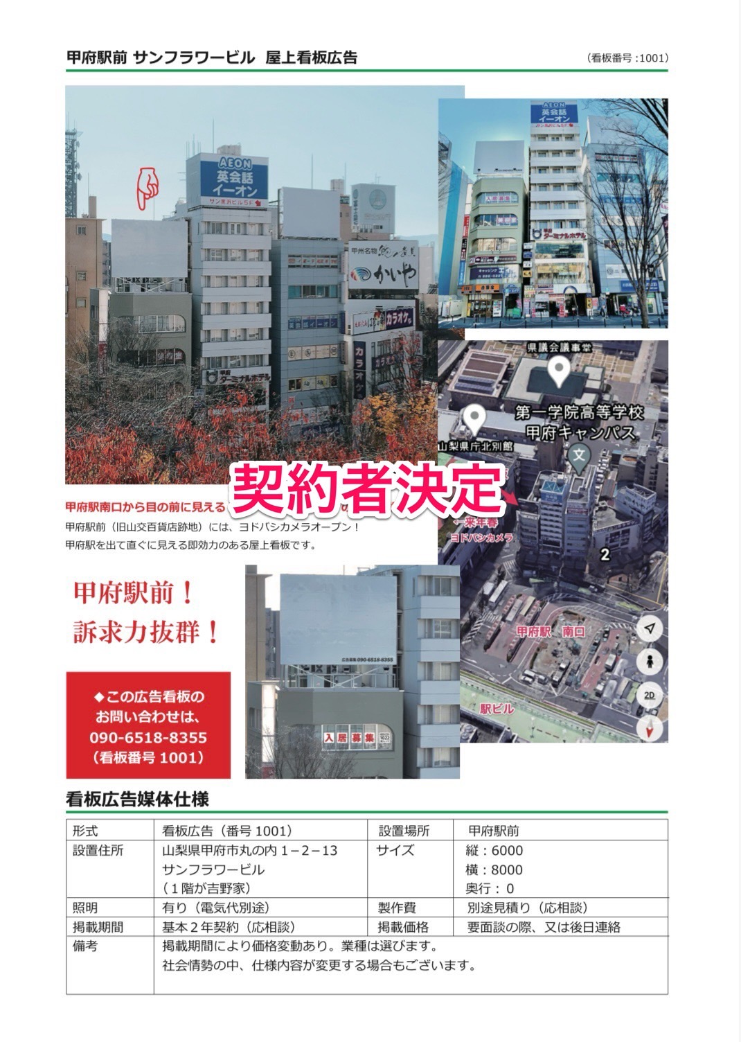 甲府駅前の一等地のビルの屋上にイメージアップ看板が取り付け可能です。商品のイメージを向上させたい!企業イメージを浸透させたい!未来に役立つ屋上ビル看板をご利用ください。掲載価格もご相談可能です。