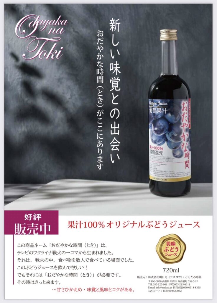 果汁100%オリジナルぶどうジュース「おだやかな時間」好評発売中!
