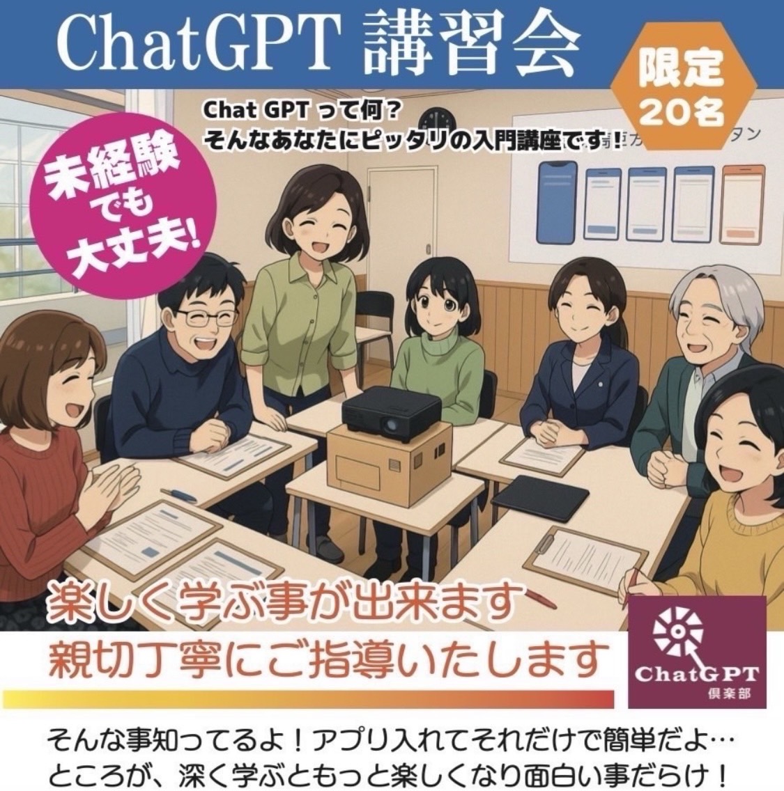 ChatGPT倶楽部では、ChatGPT講習会を開催しております♪Zoomやネットセミナーと違い講師が対面式に行います。和気あいあいの楽しい講習会です。是非ご参加くださいませ。